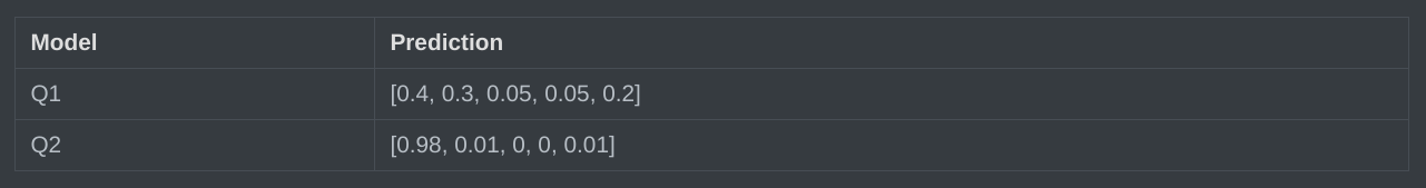 假设有两个机器学习模型对第一张照片分别作出了预测:Q1 和 Q2,而第一张照片的真实标签为 [1,0,0,0,0]。